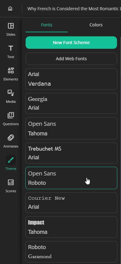 Hover the mouse over available fonts to see how they apply to your work slides.