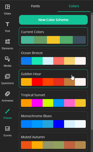 Hover the mouse over the available color scheme to see how they apply to your work slides.