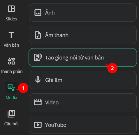 Trên menu bên trái, nhấp vào Media, sau đó chọn Tạo giọng nói từ văn bản.