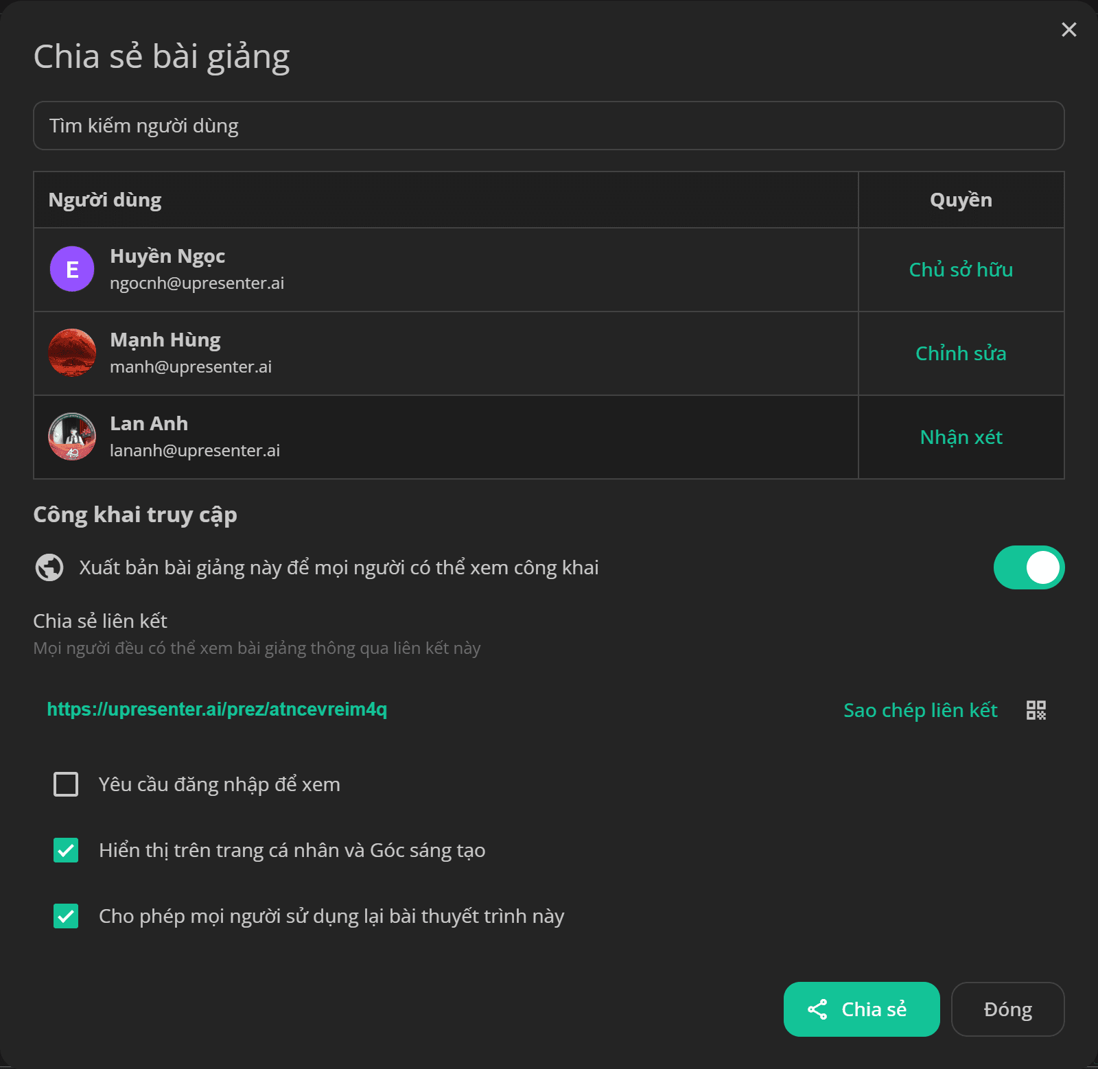 Lưu ý: Để người khác có thể truy cập liên kết của bạn, hãy đảm bảo bài giảng của bạn được cài đặt ở chế độ công khai. Bạn có thể thực hiện việc này bằng cách bật nút Xuất bản bài giảng này để mọi người có thể xem công khai và sao chép liên kết trong phần Chia sẻ.